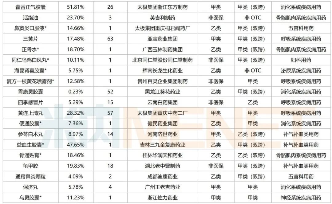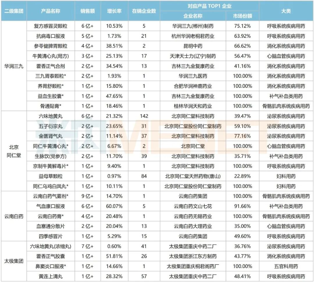 从厂家情况(以二级集团计)看,91个中成药中,有42个为独家品种(含独家剂型),其中,华润三九以4个品种领跑,北京同仁堂以3个品种紧接其后,云南白药、步长制药、桂林三金、津药达仁堂、以岭药业、康臣药业、广东罗浮山国药均有2个品种在列,奇正藏药、健民药业、亚宝药业、佐力药业等20余家企业亦有品种在列。
