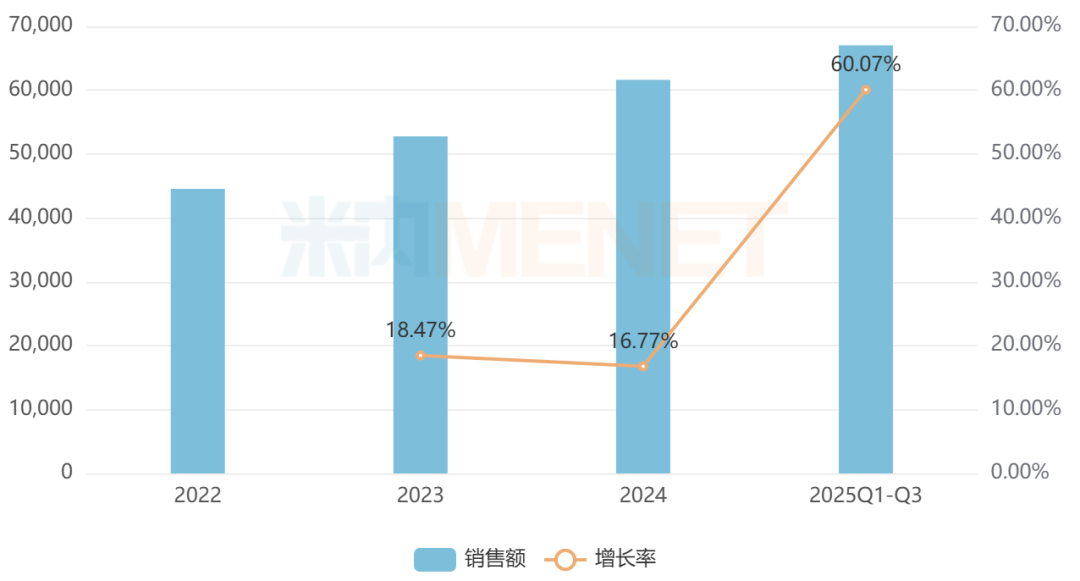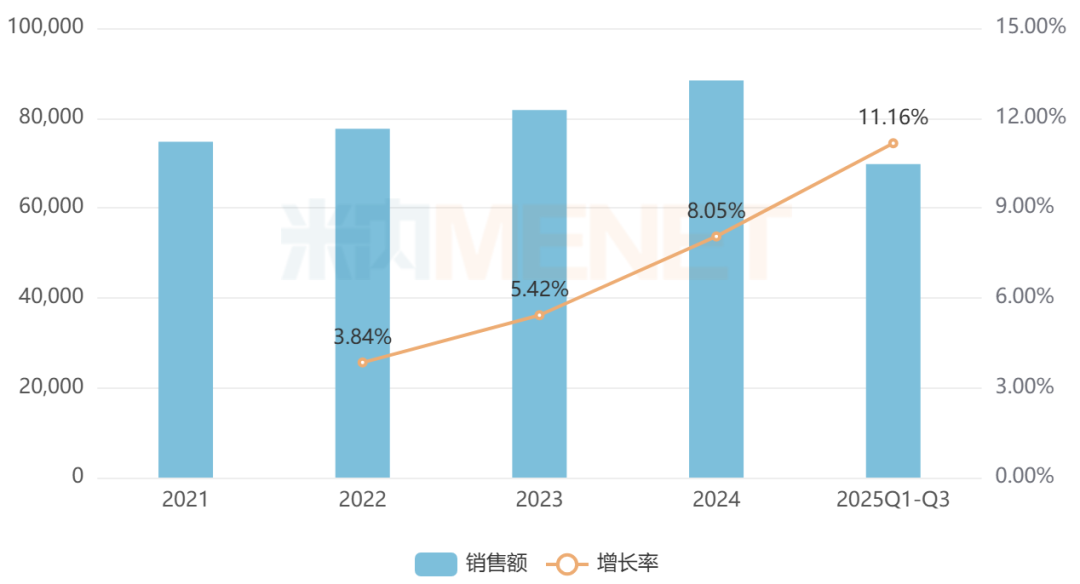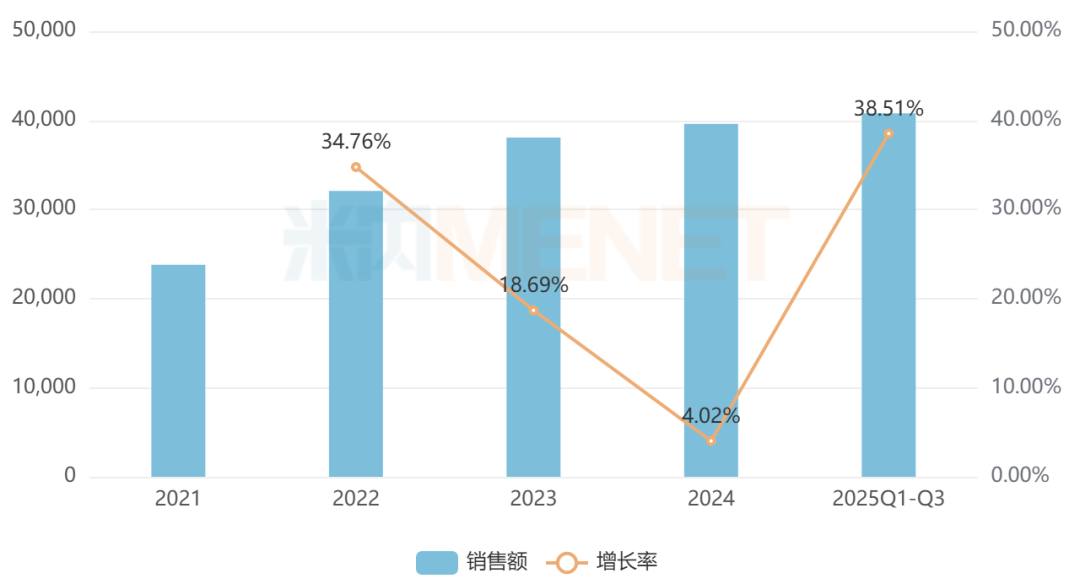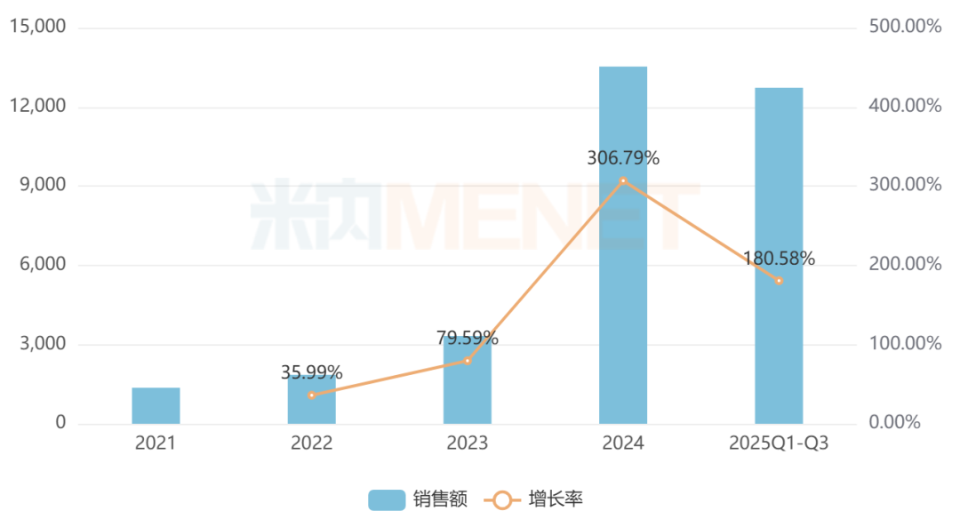 有14家企业在销的苏合香丸为国家医保甲类品种,该药源于盛唐,兴于姑苏,以芳香开窍药物为主要成分,具有芳香开窍、行气止痛的功效。数据显示,2020年至今,苏合香丸在中国零售药店终端的销售额增速均达两位数或三位数,2024年其销售额超过1.3亿元,2025年前三季度以约180%的增速继续增长。从厂家竞争格局看,雷允上药业稳居TOP1品牌。
