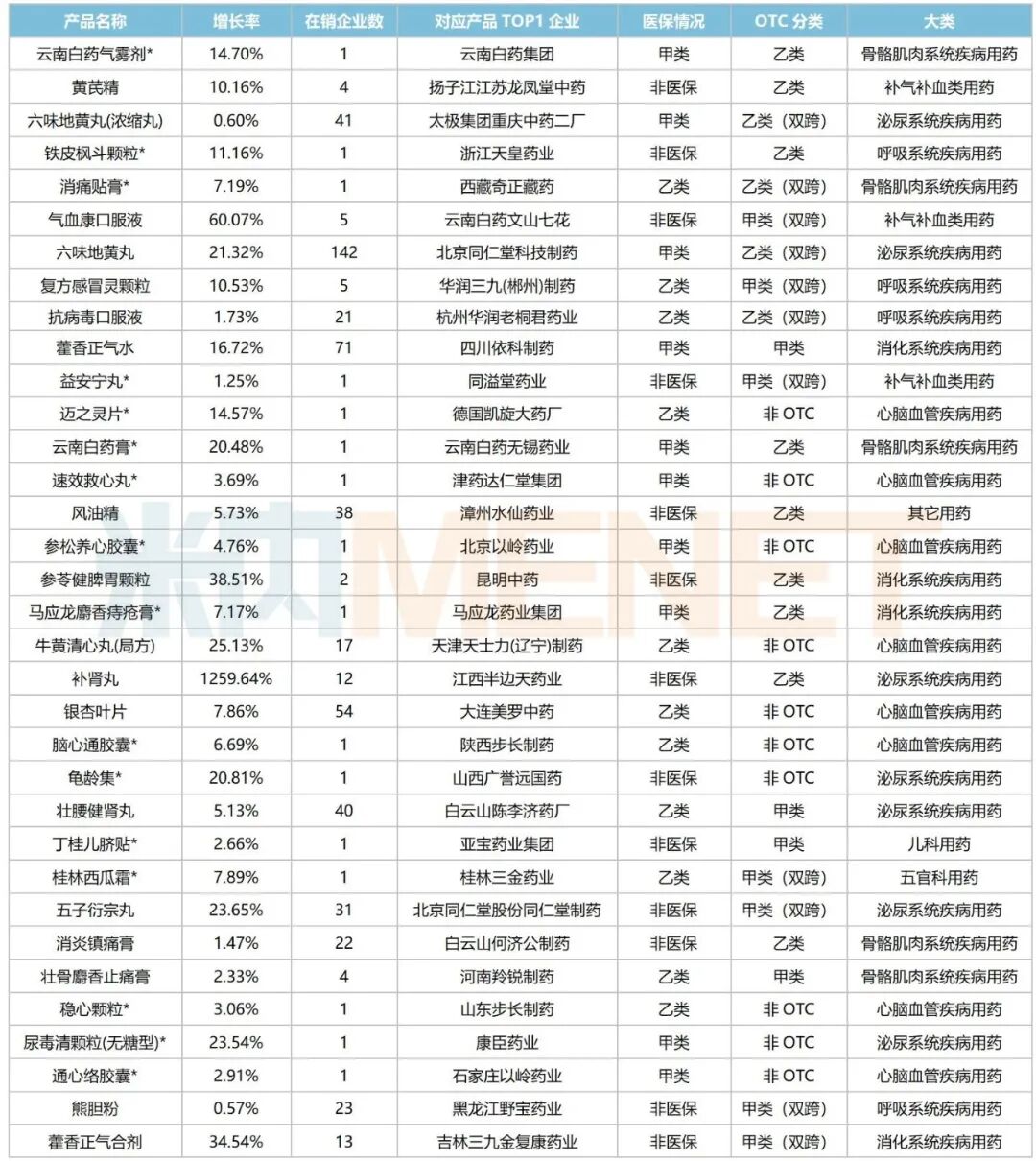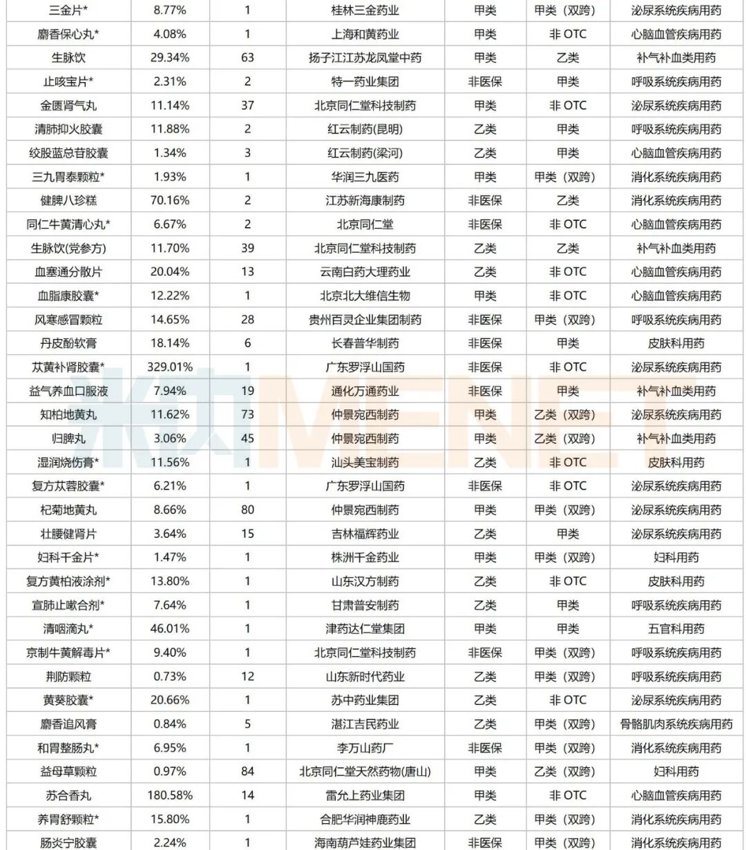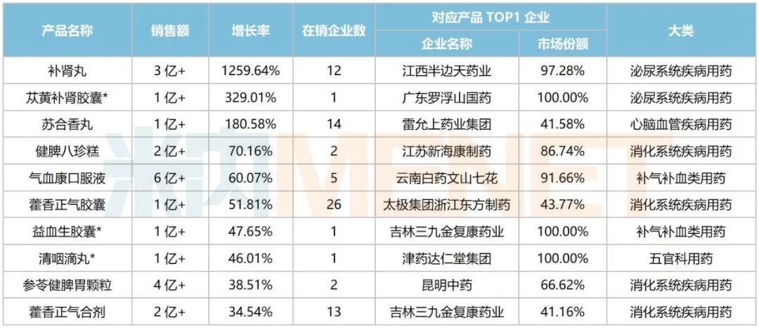 注:标*为独家中成药10个中成药中,苏合香丸、益血生胶囊(吉林三九金复康药业独家)、参苓健脾胃颗粒等自2020以来保持持续正增长,苁黄补肾胶囊(广东罗浮山国药独家)自2022年以来保持三位数及以上的增长等,市场潜力较大。