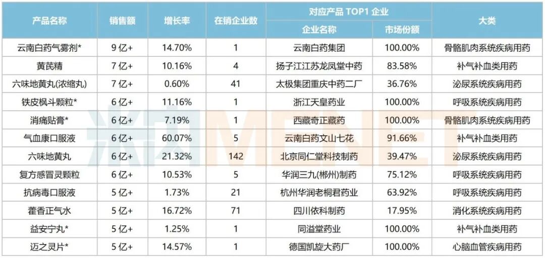 12个超5亿大品种中,有5个为独家品种(含独家剂型),分别为云南白药集团的云南白药气雾剂、浙江天皇药业的铁皮枫斗颗粒、西藏奇正藏药的消痛贴膏、同溢堂药业的益安宁丸、德国凯旋大药厂的迈之灵片。