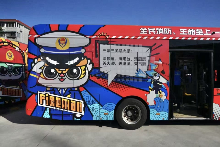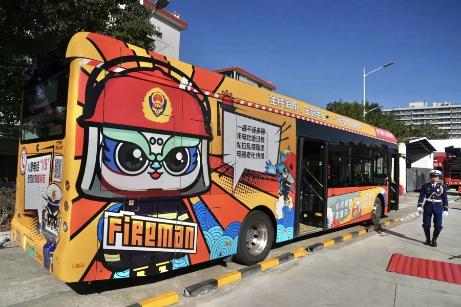 消防巴士以上海消防文创IP形象“鸱吻”为设计灵感,“鸱吻”源自中国古代神话中龙之第九子,寓意“嫉火如仇”,象征着消防救援队伍灭火救援、守护城市平安的坚定决心。消防巴士车身采用消防标志性的红蓝两色、橙黄亮色为主色调,搭配“全民消防,生命至上——安全用火用电”消防宣传月主题标语和防火提示,成为穿梭在城市中亮眼的“移动消防宣传站”。