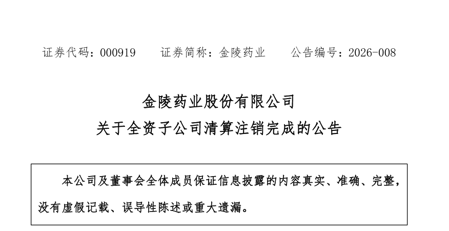 2026年02月25日,金陵药业发布公告,子公司湖州邦健天峰药业有限公司已完成清算注销,清算注销完成后,邦健天峰将不再纳入公司合并财务报表范围,不会对公司本期和未来的财务状况及经营成果产生重大影响。
